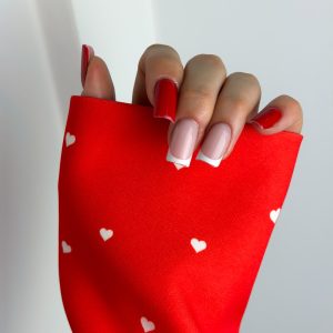 Mouw in blazerstijl, valentijnsrood met witte hartjes